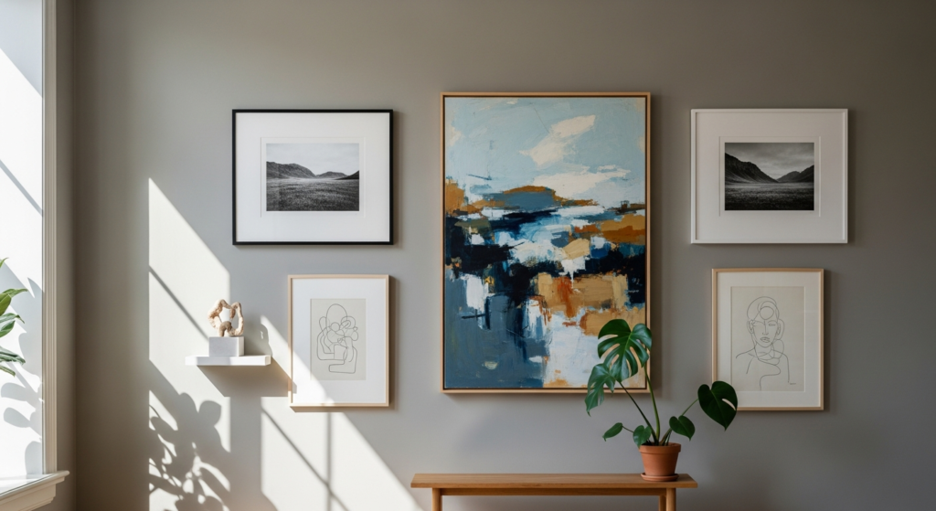 Curate a mix of abstract art, photography, and framed prints. Maintain consistent spacing and color harmony.