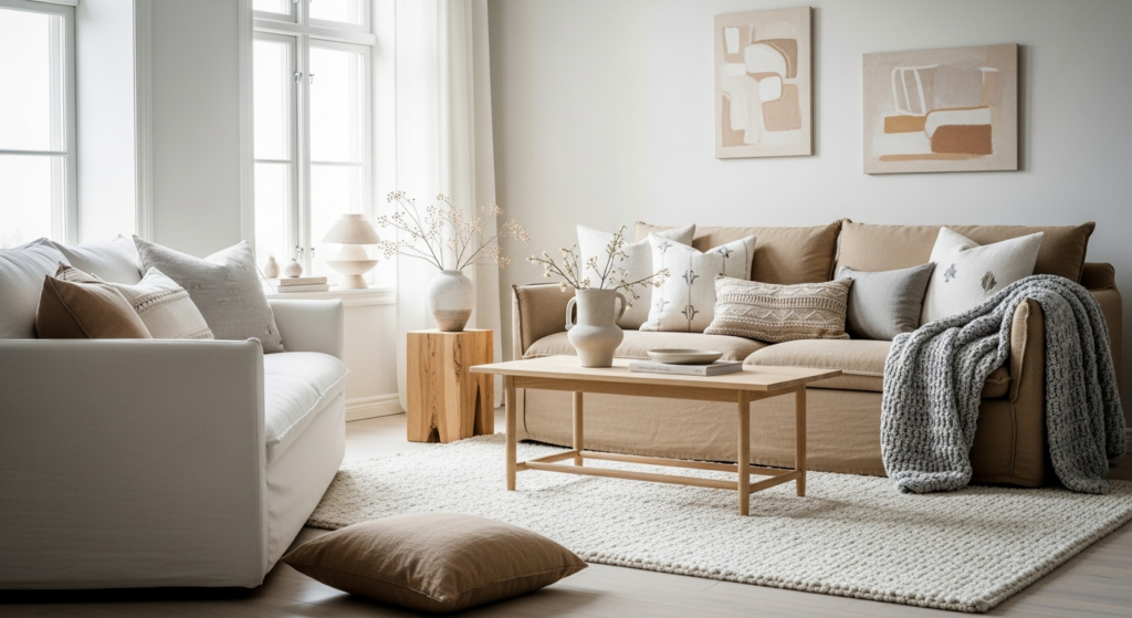 Layer whites, creams, and warm beiges with subtle contrasts. Add depth through textured fabrics like boucle, linen, and wool for a cozy yet polished look.