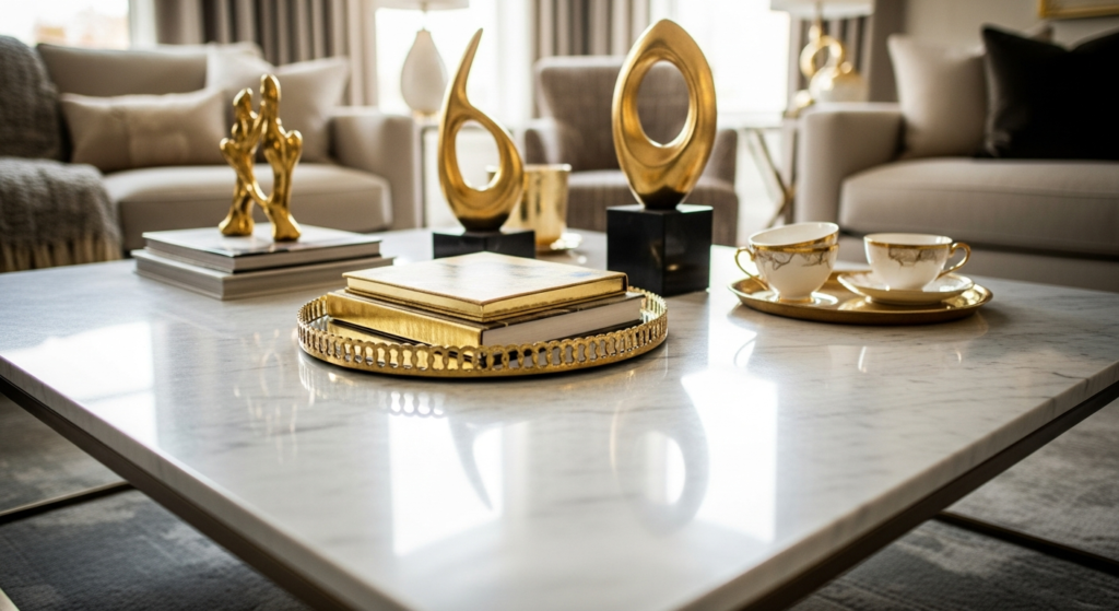 Add decorative trays, candles, books, and metallic accents. Keep styling intentional and uncluttered for a high-end finish.