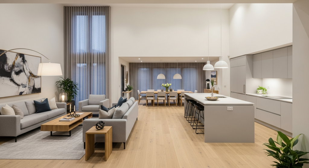 Avoid overcrowding. Use rugs and furniture placement to define zones while maintaining openness.