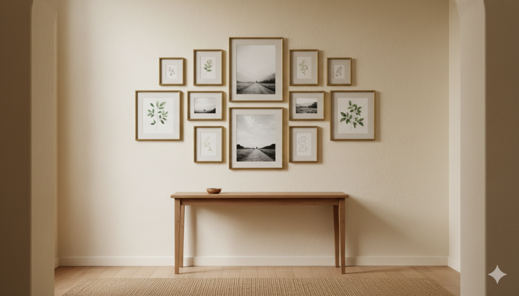 Styling Tip: Choose a single frame style and finish for the entire entryway gallery wall — all thin black, all aged brass, all raw oak, or all wide white — and vary only the sizes of the frames rather than their style. This consistency creates the visual unity that makes a gallery wall read as a single, composed design element rather than a random collection of differently framed images. Map the gallery wall arrangement on paper or on the floor before hanging a single nail — lay out the full composition and adjust until the arrangement is balanced, with the visual centre of gravity of the entire group at eye level, before committing to the wall.