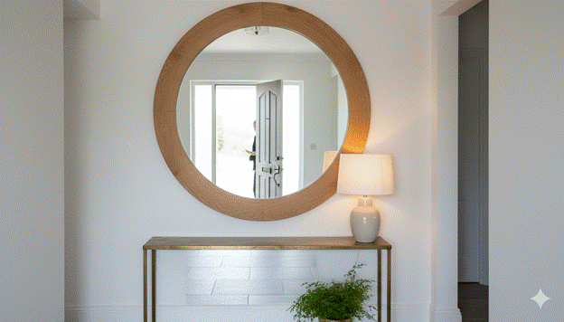 The scale and framing of the mirror are its two most critical design qualities. Oversized is almost always better than undersized in an entryway context — a mirror that spans 70-80% of the wall width it occupies creates a quality of spatial expansion and visual drama that a smaller mirror cannot achieve. The frame should reflect the home’s material palette: aged timber for a warm, organic aesthetic; raw brass or antique gold for a more glamorous result; slim matte black for a clean, contemporary statement; or unframed with a polished edge for the most minimal, most architecturally pure interpretation.