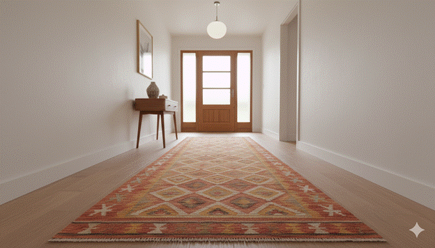 Styling Tip: Size the entryway rug so that it covers the transition zone from the front door to the first interior wall or furniture piece — a rug that ends awkwardly short of the primary furniture or the first interior threshold creates a spatially unresolved quality. In a narrow hallway, choose a runner of at least 60-70cm width that allows comfortable bilateral movement without the rug appearing undersized relative to the corridor. Layer an anti-slip mat beneath the rug for both safety and to prevent the rug from shifting under foot traffic. Choose a pattern or texture that provides visual interest — this is one of the few places in the home where a bold geometric, a heritage stripe, or an intensely patterned traditional rug can be used to full effect without overwhelming the space.