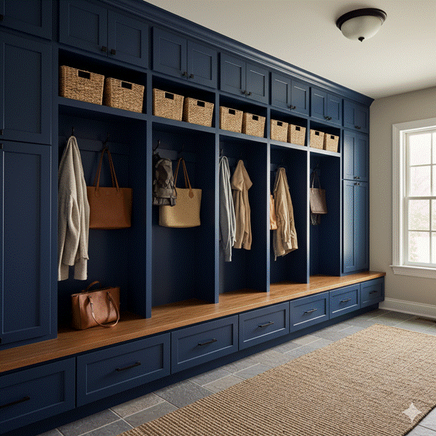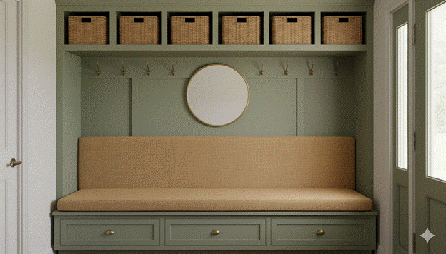 Styling Tip: The most beautiful functional mudroom-style entryways are those in which the practical storage infrastructure is designed with the same care as the purely decorative elements. Choose cabinet paint in a deep, rich tone — deep navy, forest green, warm charcoal, or dusty sage — that makes the storage system a genuine design statement rather than a neutral backdrop. Add a quality runner rug in a durable, easy-clean material along the length of the mudroom zone, a single piece of framed art or a mirror above the bench, and consistent baskets or storage vessels across all open shelving for a coherent, finished visual result.