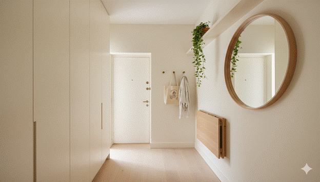 Styling Tip: The most impactful investment for a small entryway is the installation of a floor-to-ceiling built-in unit in the same paint colour as the surrounding walls — this creates storage of considerable depth and volume while the colour consistency prevents it from visually advancing into the space as a separate, space-consuming object. A push-to-open mechanism rather than external handles maintains the seamless, wall-like quality of the built-in and prevents hardware from creating visual clutter. One quality pendant light at the room’s centre, one large round mirror, and one small-scale plant complete the small entryway design without adding bulk to a space that must remain spatially generous above all other aesthetic priorities.