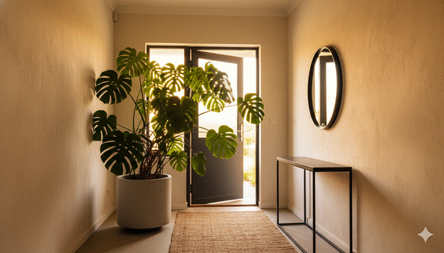 The most visually impactful entryway plant choices are those with strong, architectural forms that create a striking silhouette in the entryway’s relatively compact space: a tall, slender Fiddle Leaf Fig that reaches toward the ceiling; a graphic, sculptural Monstera deliciosa; a cascade of trailing Pothos from a high shelf; or — for the most specific, architectural quality — a small Olive tree in a large woven basket planter that creates the impression of a Mediterranean courtyard brought indoors.