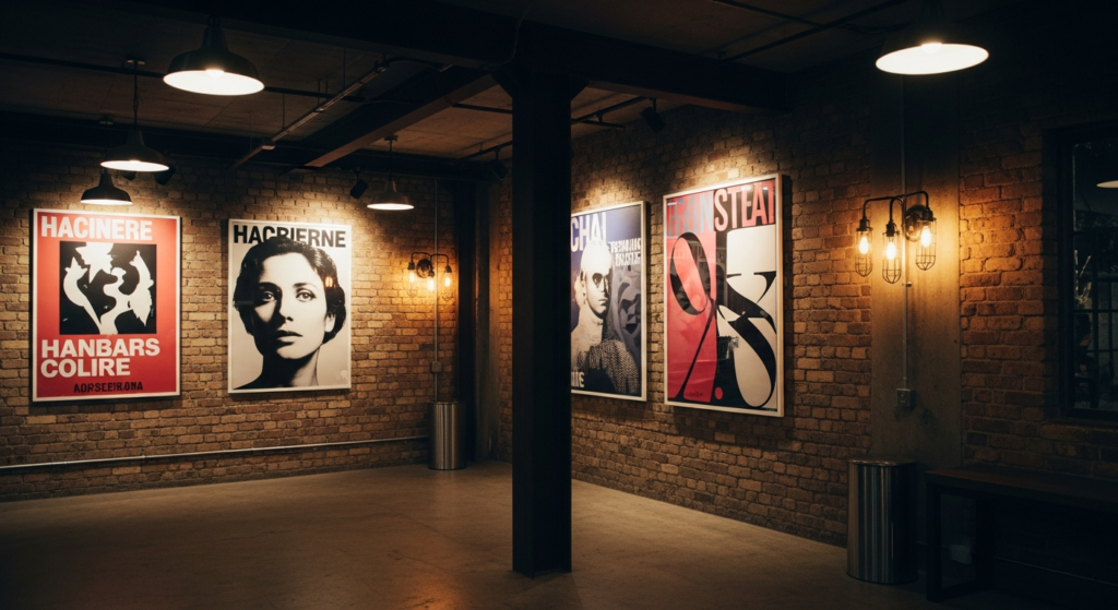 Oversized flyer-inspired prints anchor the room visually.