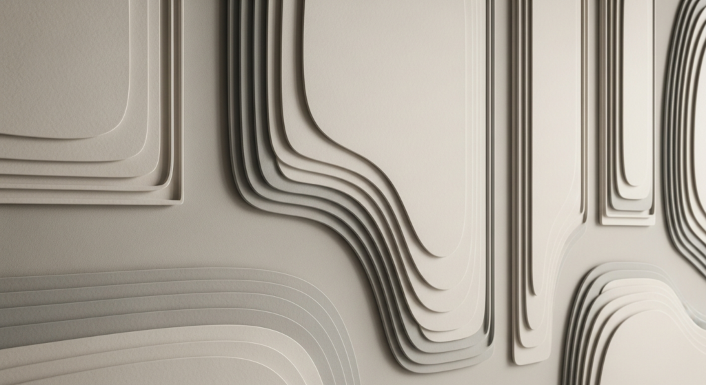Wall panels can mimic layered, tactile surfaces.