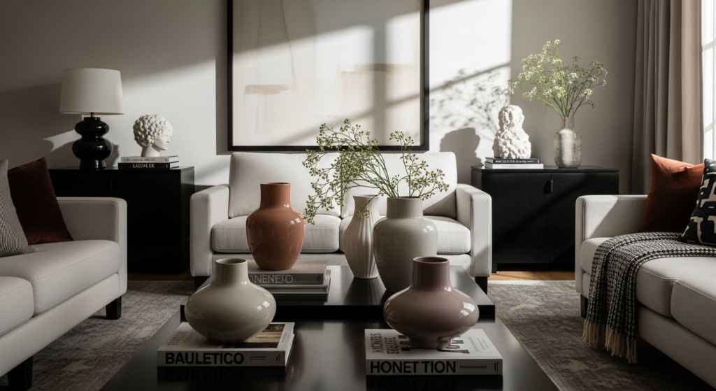 Use layered textures, statement furniture, warm lighting, and minimal yet high-quality decor pieces.