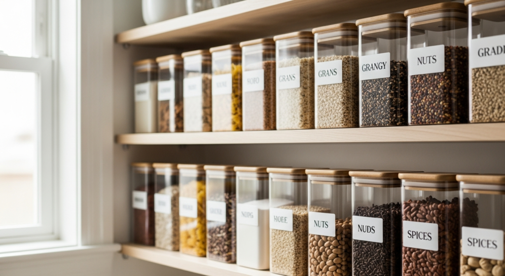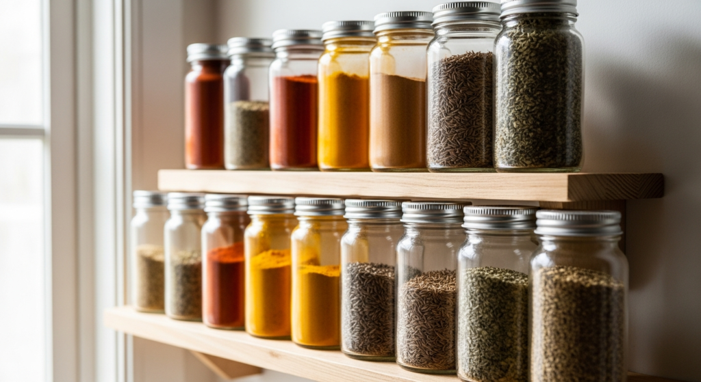 Transparent, labeled jars arranged neatly in racks or drawers work best.
