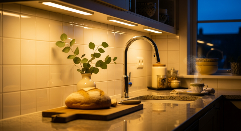 Install warm under-cabinet lighting for a soft, inviting glow.