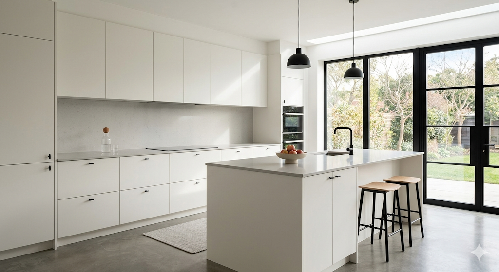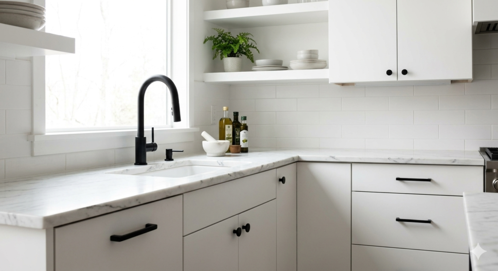 Matte black accents create striking contrast in modern kitchens. From cabinet handles to faucets, these details feel bold yet refined.