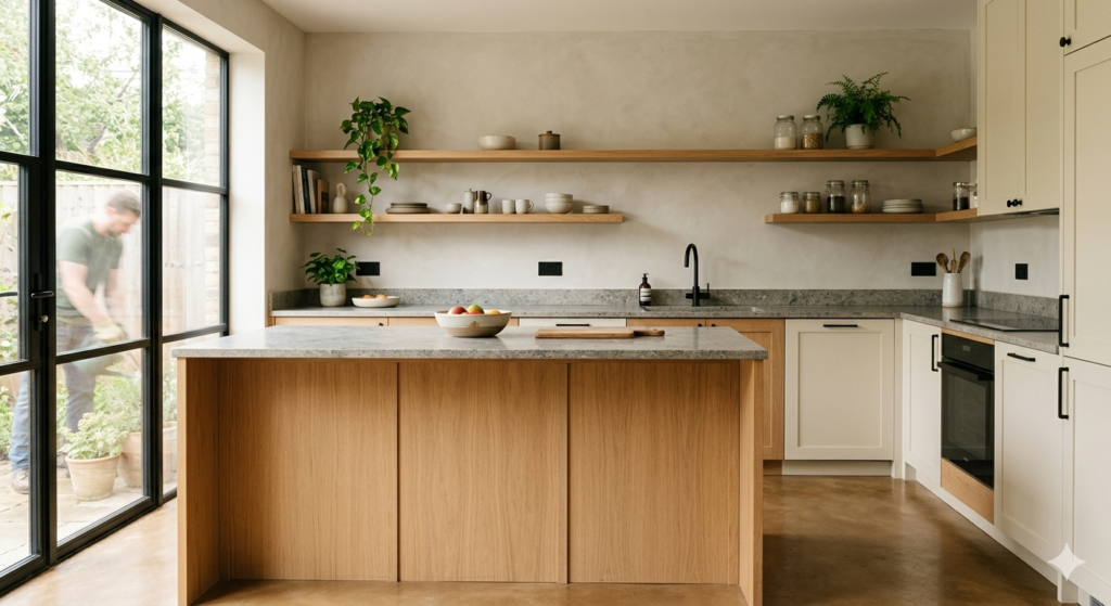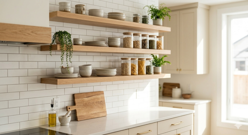 Open shelving adds a curated, lifestyle-inspired aesthetic to the kitchen. Instead of hiding everything behind cabinets, shelves allow you to showcase beautiful items.