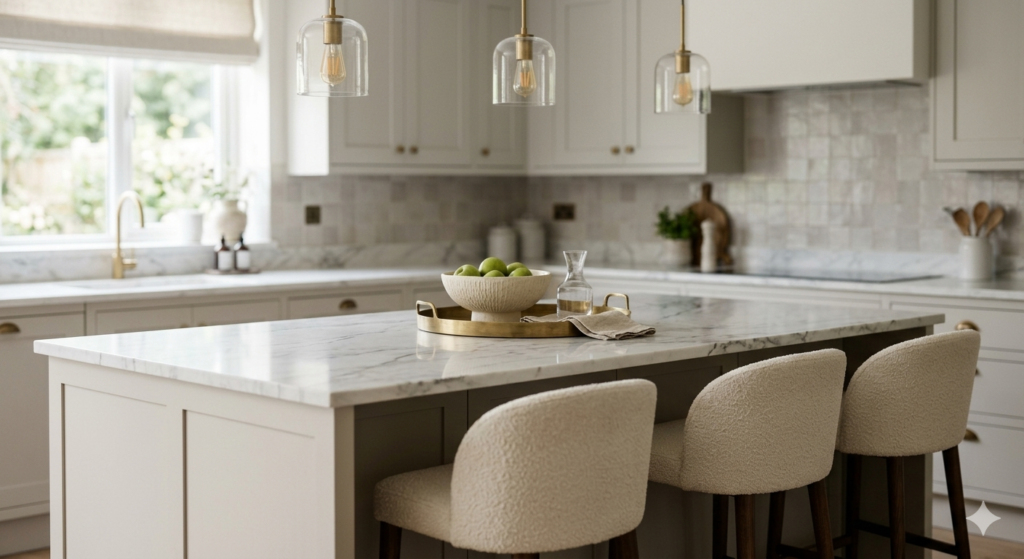 Materials like marble, quartz, natural wood, brass accents, and high-quality lighting fixtures instantly elevate the look of a kitchen.
