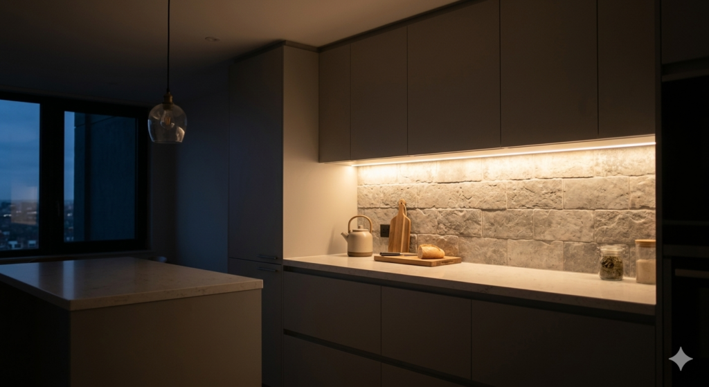 Soft under-cabinet lighting adds depth and warmth to a kitchen. It highlights textures while improving visibility during cooking.