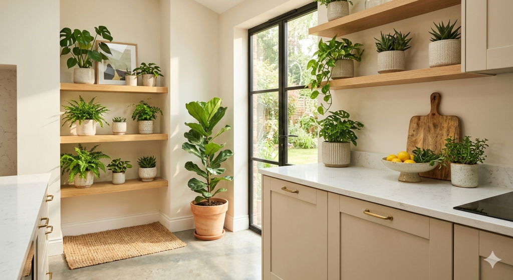 Adding greenery instantly brings life and freshness to a kitchen. Plants introduce color, texture, and a natural aesthetic.
