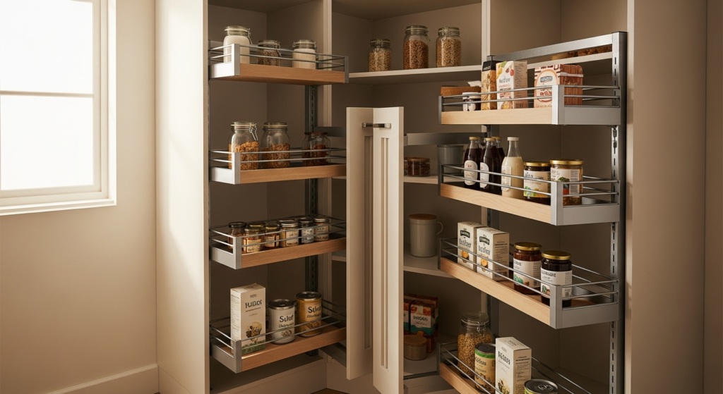 Corners are often underutilized. Rotating shelves or pull-out racks make these areas functional.