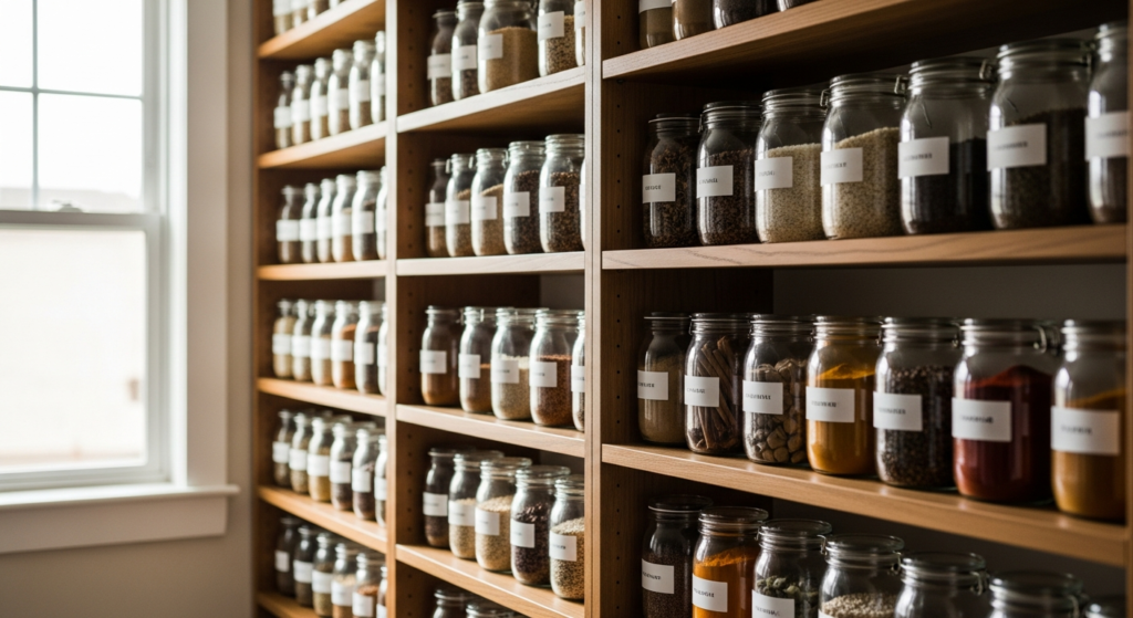 Use uniform containers for a clean look. Position shelves where natural light enhances clarity and brightness.
