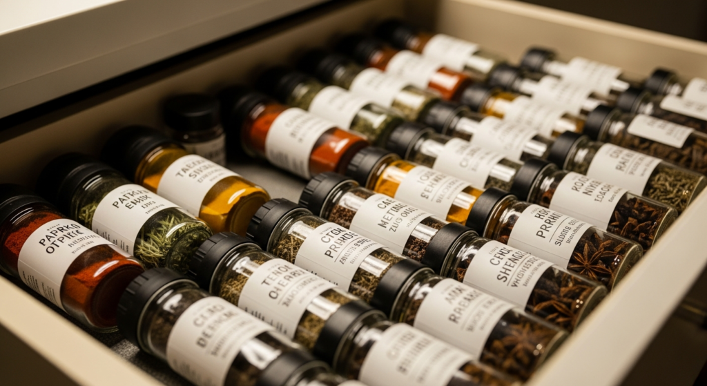 Dedicated spice drawers make everyday cooking more efficient. Arrange jars horizontally for easy visibility.