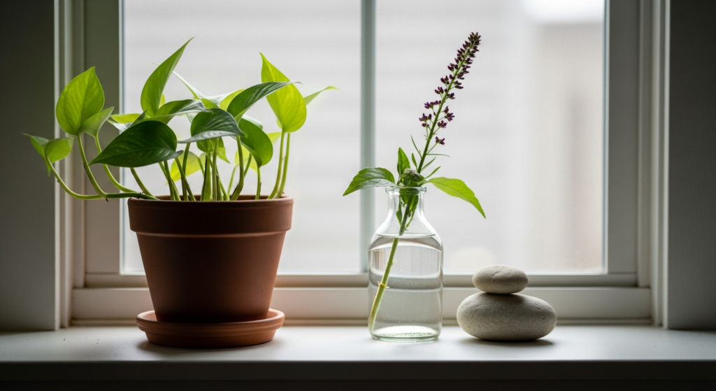 • Beyond plants, the windowsill is an ideal location for a small, beautiful still-life arrangement: a single ceramic object, a clear glass vase with a seasonal cutting, and one natural element (a small stone, a piece of coral, a smooth river pebble) together create a composition that changes with the light throughout the day.