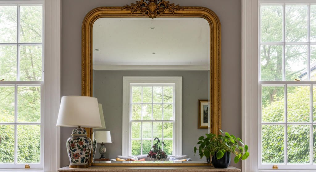 • Place mirrors at or slightly below eye level when seated — this ensures that the reflection includes the most beautiful elements of the opposite wall at the height from which the room is most frequently experienced.