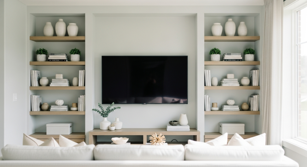 Built-in cabinetry frames the TV beautifully.