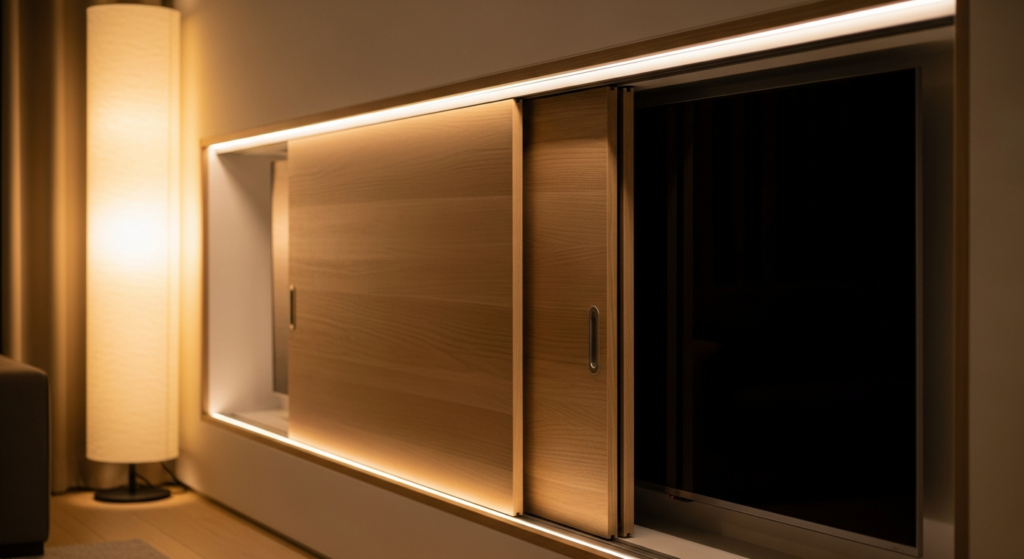 Panels or sliding doors hide the screen when not in use.