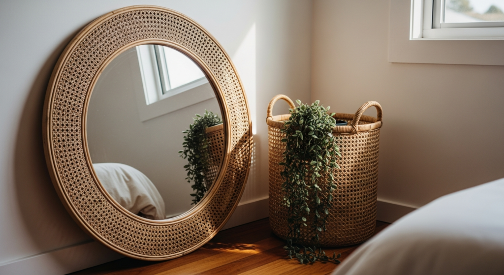 A mirror in a beautiful rattan, natural timber, or woven frame placed in a bedroom corner introduces the warmth of organic, natural materials into the room’s design in a particularly beautiful and particularly functional way. Natural material frames add texture, warmth, and an organic quality that metal and synthetic frames cannot replicate.