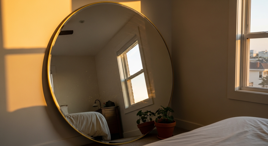 Styling Tip: The power of an oversized round mirror in a bedroom corner lies in its proportional unexpectedness — choosing a mirror that is larger than seems strictly necessary creates an impression of genuine design ambition and genuine spatial generosity. Choose a round mirror in a warm, simple frame — a single thin gold band, a natural timber circle, or a simple black outline — that allows the scale of the mirror to read most clearly without the frame competing for attention. Position on the floor in the corner, leaned against both walls simultaneously for the most stable and the most editorial placement quality.