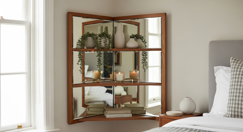 A slim, mirrored shelf unit — fitted into the corner with mirrored back panels that reflect the room — combines practical storage with the light-expanding, space-enhancing qualities of mirror in a single, deeply elegant bedroom corner design solution. It transforms an architecturally awkward corner space into a genuinely useful and genuinely beautiful feature.