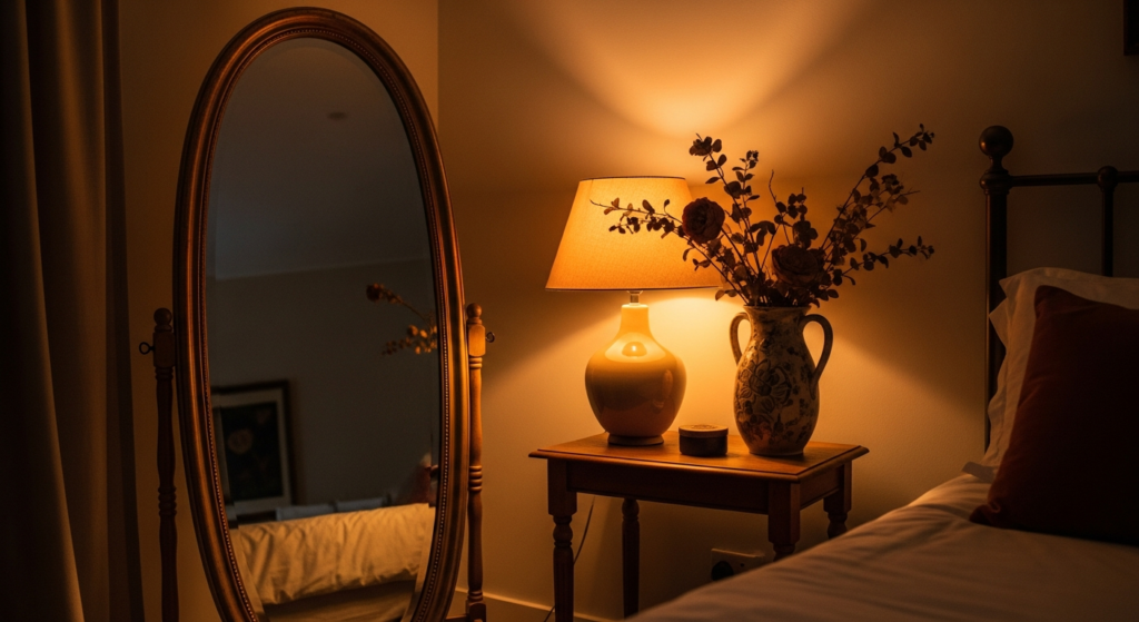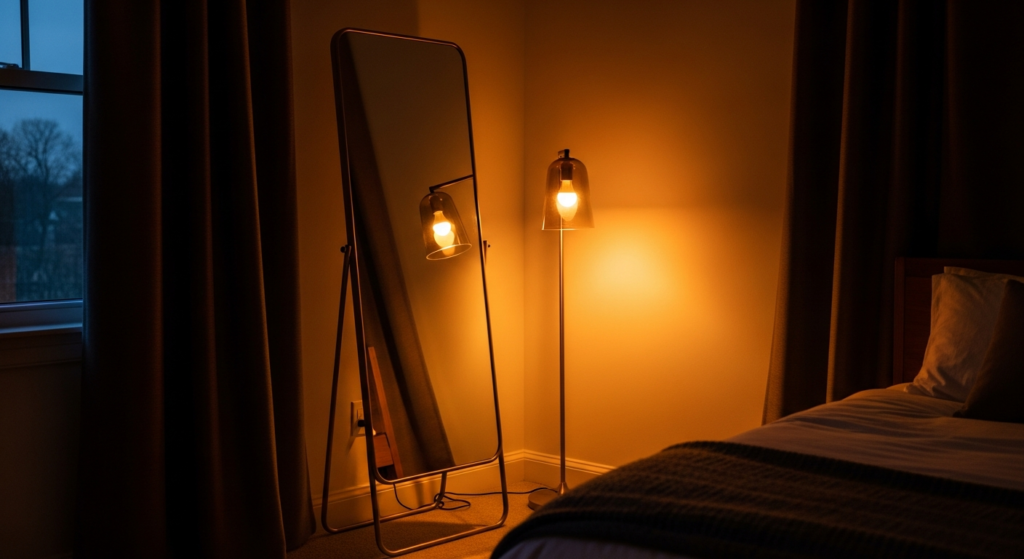 Q4: How do I light a bedroom corner mirror most effectively? The most effective bedroom corner mirror lighting uses warm-toned light sources positioned beside or above the mirror rather than directly in front of it — this creates a warm glow that is reflected back into the room rather than a flat, frontal illumination that flattens the reflection quality. A floor lamp positioned to the side of a full-length leaned mirror, wall sconces flanking a hanging mirror, or warm-toned LED lighting within a mirrored shelf unit all create beautiful, warm, and functional mirror lighting in a bedroom corner. Always use warm-toned bulbs at 2700K to 3000K and install dimmer switches for complete atmospheric control.