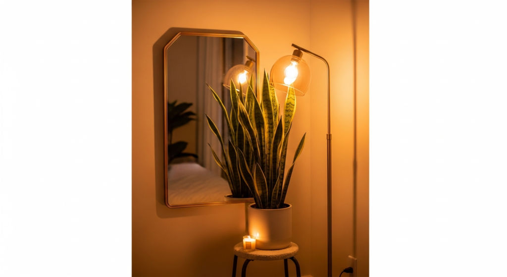Styling Tip: Build the mirror corner vignette around the mirror as the visual anchor — choose a medium to large mirror in a warm frame and hang or lean it in the corner. Add a floor lamp beside it for warm, intimate light. Place one or two architectural plants in quality ceramic pots on the floor nearby — a tall snake plant or a trailing pothos in a hanging pot above adds organic height and movement. Include a small low piece of furniture — a stool, a small bedside table, or a low wooden crate — to add a surface for a candle or a small plant. The layered composition of mirror, light, and botanical elements creates a corner of extraordinary, lived-in beauty.