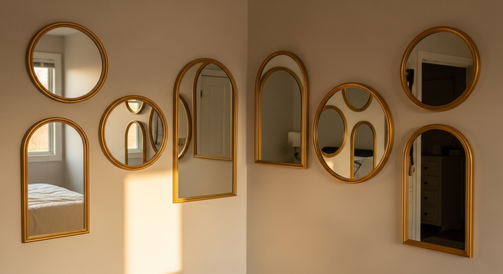 Styling Tip: Plan the gallery mirror corner composition by laying all mirrors on the floor in the approximate arrangement before committing to wall placement. Mix circular, rectangular, and arched mirrors for the most interesting and most organic composition. Keep frame tones consistent — all warm gold, all aged brass, or all natural timber — while allowing size and shape variation for visual richness. The arrangement should feel curated rather than random — a clear visual centre point, usually the largest or most decorative mirror, with smaller mirrors radiating outward from it in a composition that feels balanced without being symmetrically rigid.
