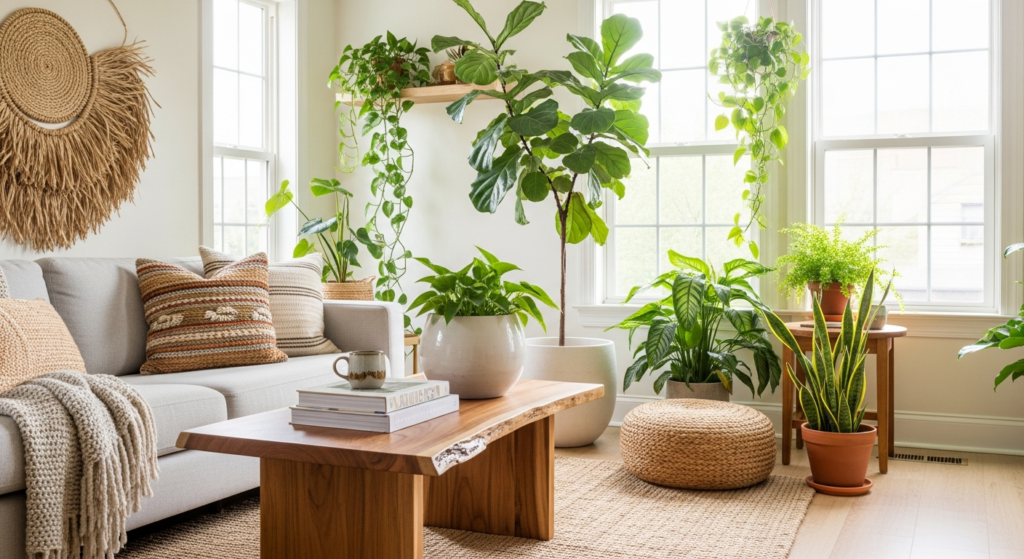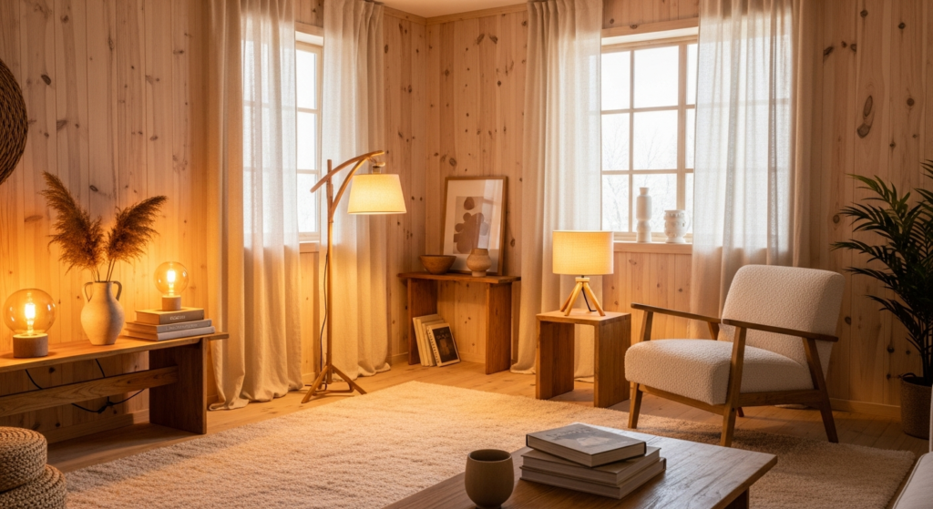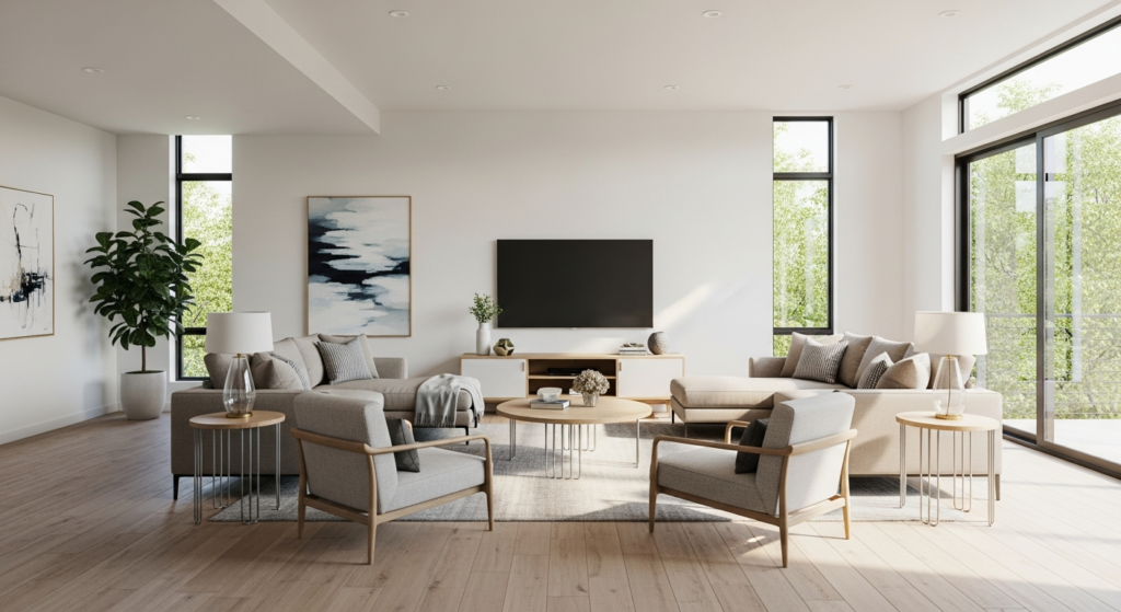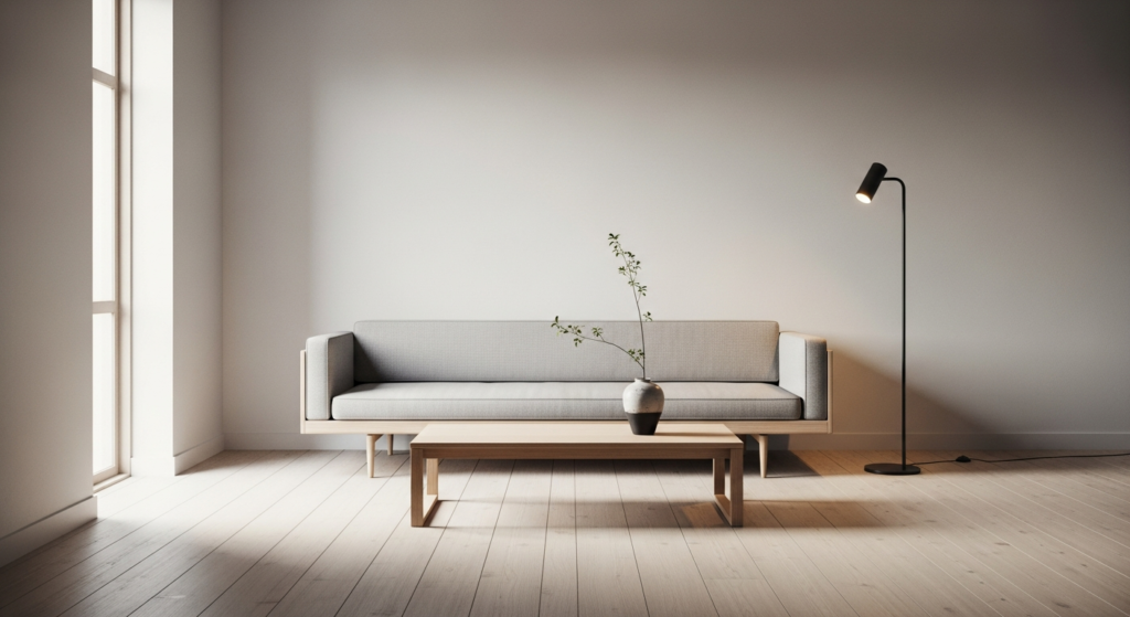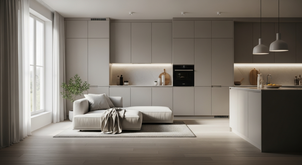 Focus on neutral colors, clean layouts, natural materials, and thoughtful lighting.