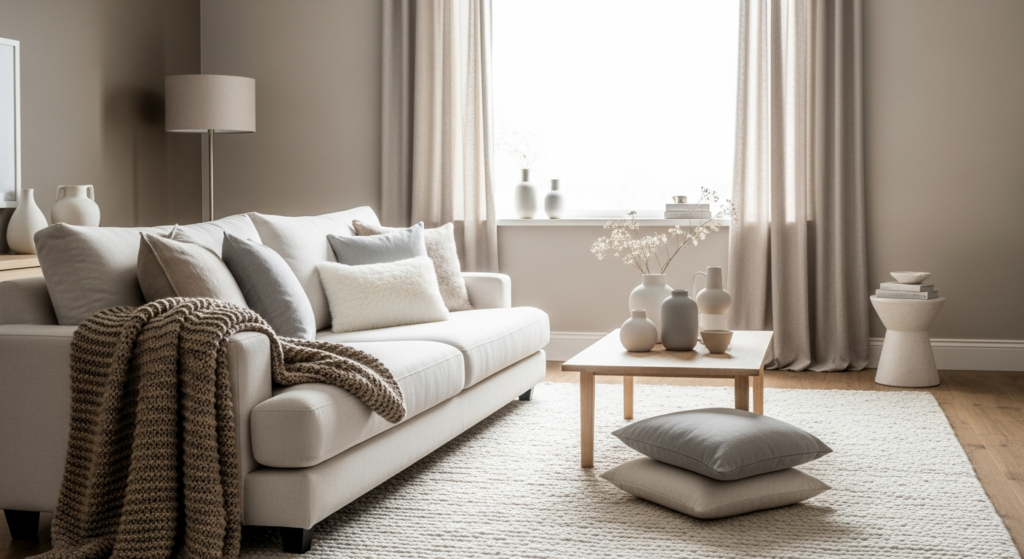 Soft neutrals like beige, white, and grey create a timeless and elegant look.