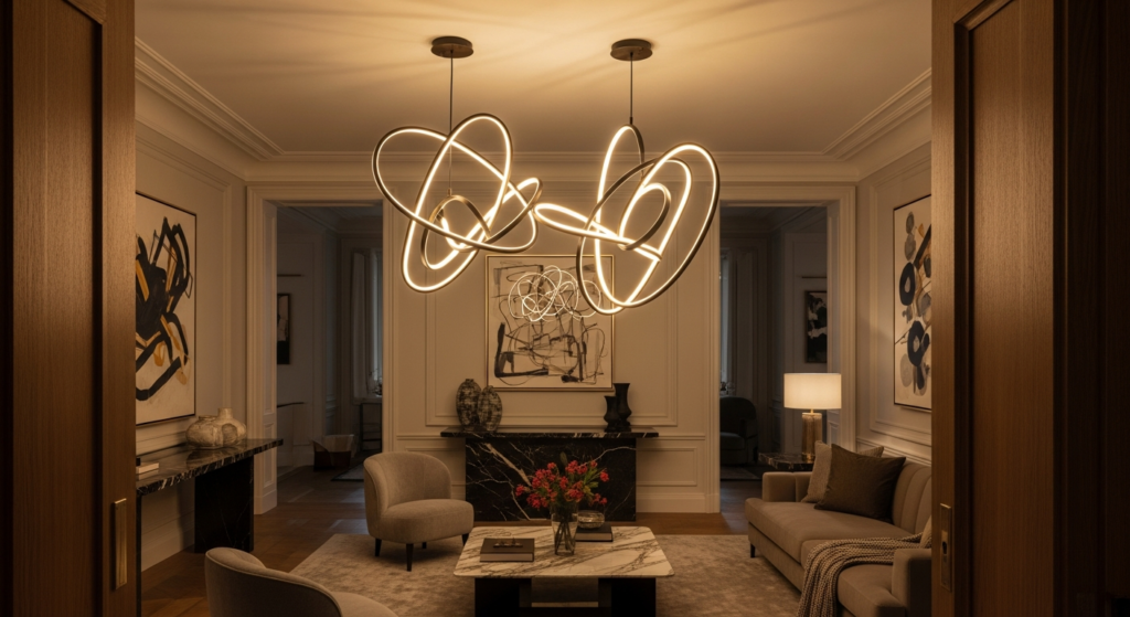 Choose sculptural fixtures and warm tones to create a welcoming ambiance.
