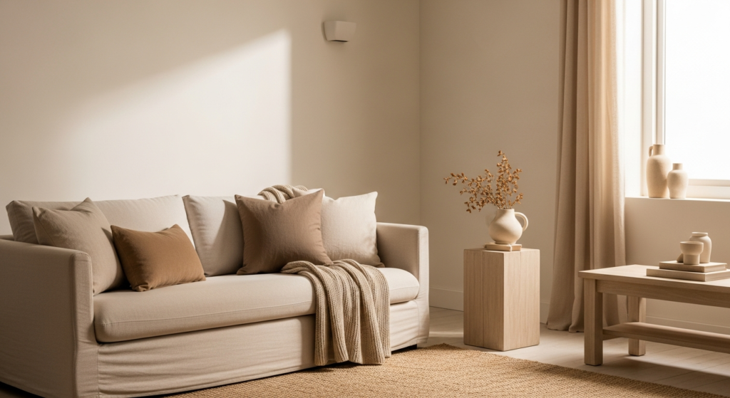 Styling Tip: Layer at least four distinct natural textures in your living room for a space that feels rich without feeling busy. A linen sofa, a jute area rug, a rattan side table, a wool throw, and a raw timber coffee table create a beautifully layered material story without introducing any colour complexity. The textures do all the visual work, allowing the palette to remain calm and cohesive.