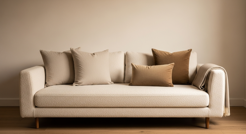 Layer the sofa with cushions in varying textures — linen, velvet, knit — and a single throw draped casually over one arm. Simplicity in the cushion arrangement is key: three to five cushions maximum, in tonal or complementary shades.