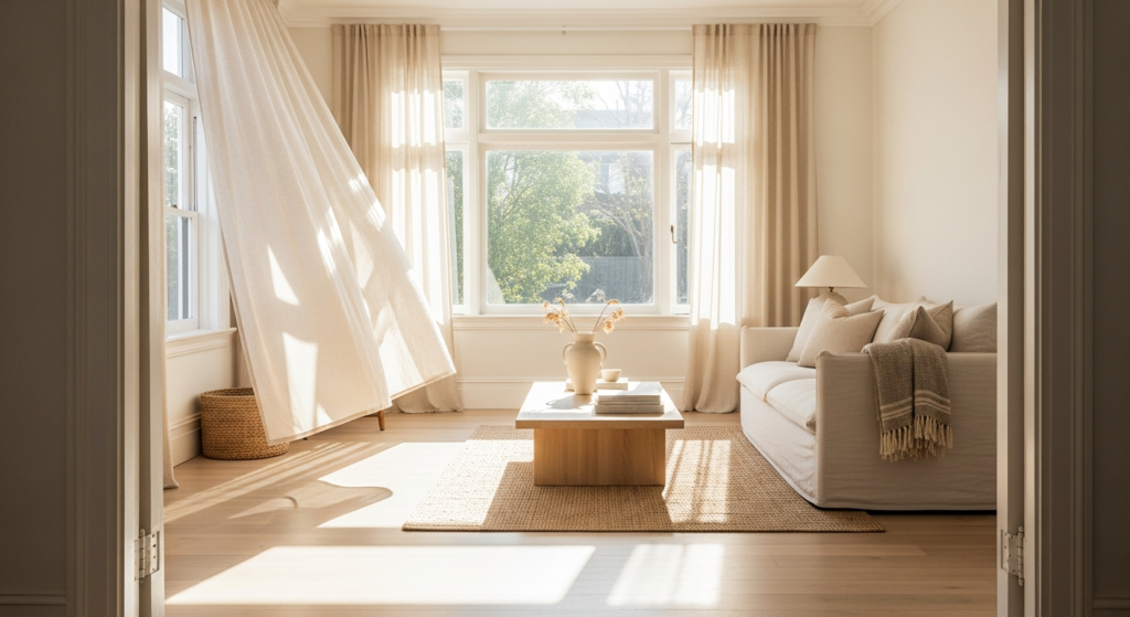 Styling Tip: Maximise natural light by choosing sheer, floor-to-ceiling curtains in ivory or white linen that filter rather than block the light. Position mirrors strategically — opposite or adjacent to windows — to reflect light deeper into the room. Keep window sills clear of heavy objects that interrupt the light flow. Pale walls and reflective surfaces like polished stone and light timber amplify natural light beautifully.