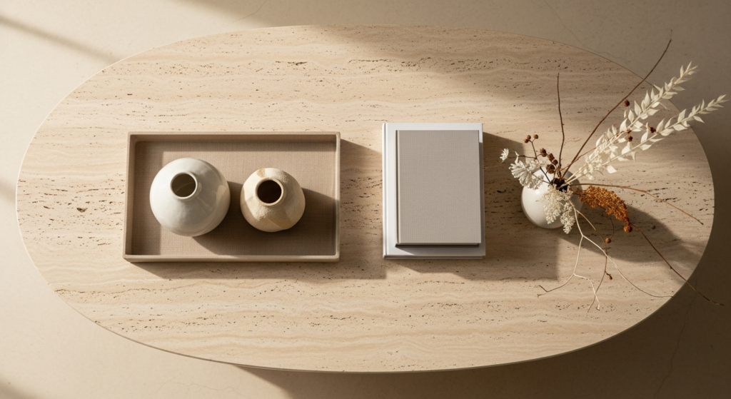Styling Tip: Choose a coffee table in a natural material — raw timber, travertine, rattan, or stone — that complements the room’s texture palette. Keep the table surface deliberately edited: a single tray holding two or three objects, a small stack of design books, and one low organic vase is all that is needed. Resist the impulse to fill the surface. Empty space on a coffee table is not a failure of styling — it is a deliberate and elegant choice.