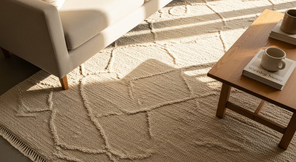 Styling Tip: Always choose a rug that is larger than you think you need — this is the most common area rug mistake in interior design. In a living room, all four sofa legs should ideally sit on the rug, or at minimum the front two legs of each seating piece. This grounds the furniture arrangement and makes the room feel complete. Choose rugs in natural fibres — wool, jute, or cotton — in warm neutrals or subtle organic patterns for the most timeless result.
