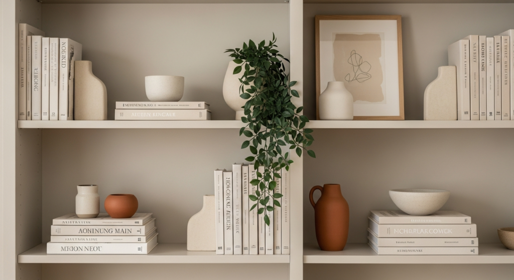 Styling Tip: The secret to beautiful shelf styling is deliberate editing. Remove everything from the shelf and return only what genuinely belongs. Mix books — arranged both vertically and horizontally — with a small selection of objects: ceramic vessels, a single plant, a stone sculpture, a framed artwork leaned against the back panel. Leave visible breathing room between groupings. Aim for approximately sixty percent filled and forty percent empty for the most elegant result.
