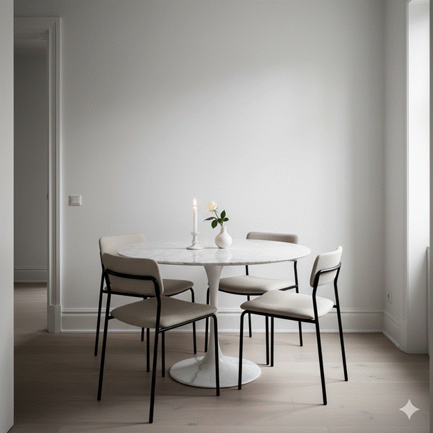 Styling Tip: Choose a round table diameter between 80cm and 100cm for 2–4 people in a small apartment. A marble or stone top adds visual weight and luxury without physically enlarging the table’s footprint, while a glass top creates the illusion of more floor space by allowing the eye to travel through the surface uninterrupted.