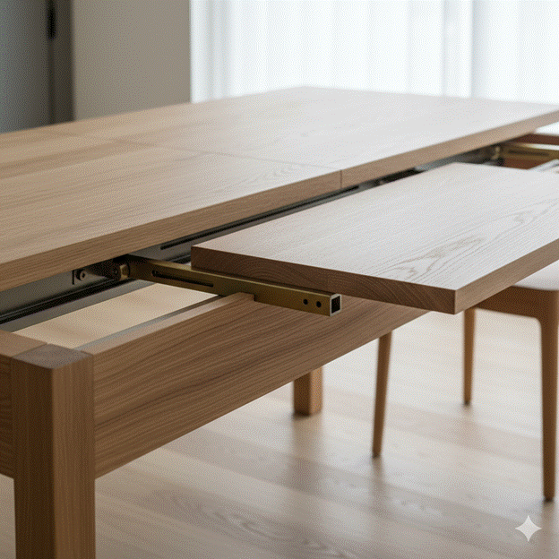 Modern extendable tables have evolved far beyond the visible leaf-and-bracket mechanisms of previous decades. The most elegant contemporary designs extend through concealed butterfly or self-storing leaf systems that maintain the table’s visual integrity in both its compact and extended configurations. At rest, they read as a considered, well-proportioned piece of furniture. Extended, they become something genuinely generous.