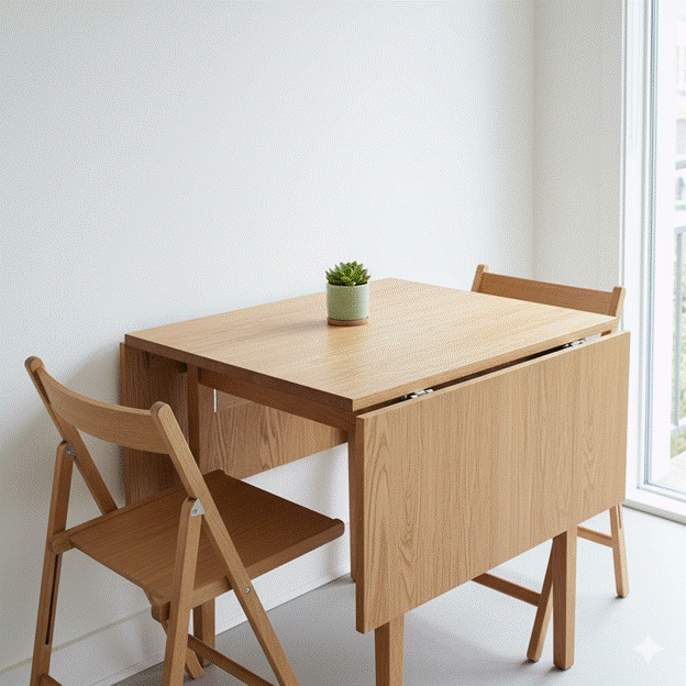 For the most space-constrained apartments, the wall-mounted drop-leaf table is a solution of elegant minimalism — a dining surface that exists only when it is needed and disappears entirely when it is not. Folded flat against the wall, it reads as a simple shelf or wall panel; extended, it provides a generous surface for meals, work, and casual gatherings.