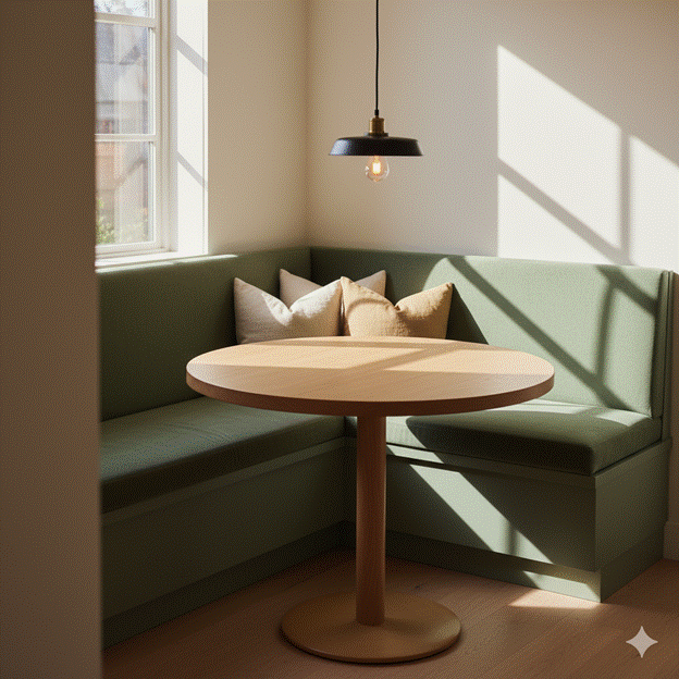 A banquette nook positioned in a corner — with bench seats along two perpendicular walls and a table fitted snugly between them — can accommodate four to six people in a footprint that a standard four-chair dining set could not begin to match. The enclosed quality of the corner adds a sense of warmth and occasion to every meal.