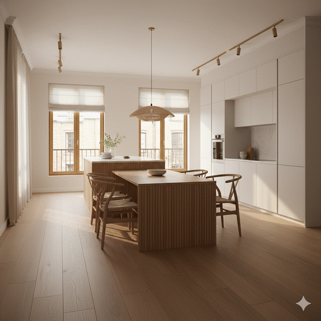 The kitchen island or breakfast bar, positioned thoughtfully, can serve double duty as both food preparation surface and informal dining table — eliminating the need for a separate dining area entirely in the smallest apartments, or providing additional seating capacity when a dedicated dining table is also present.