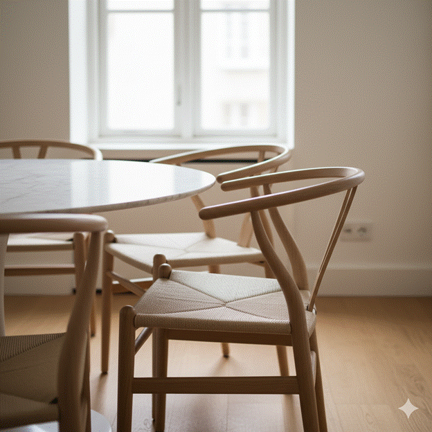 The alternative is the slim-profile dining chair: wire and bent-metal designs, slender solid timber frames, wishbone chairs, acrylic ghost chairs, or cane-backed designs that allow the eye to travel through the chair rather than stopping at its surface. These chairs provide comfortable, beautiful seating while maintaining the visual openness that small rooms require.