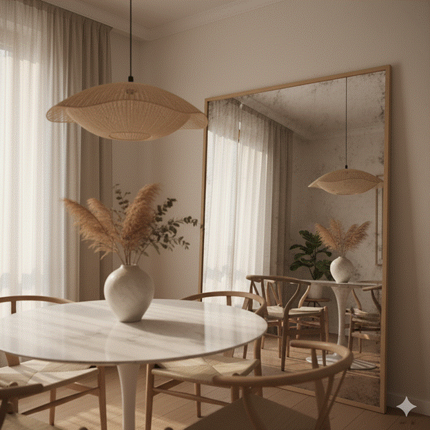 Styling Tip: Position a large mirror on the wall directly opposite the primary light source — whether a window by day or the pendant light by evening — to maximise its light-doubling effect. Frame it in a material that complements the dining table: a timber frame beside a timber table, a brass frame beside a marble table.
