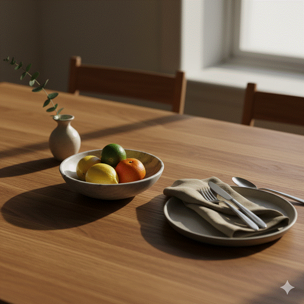 Styling Tip: If the budget allows only one natural material investment, make it the dining table. A solid timber or stone-top table is the most visible and frequently engaged surface in the dining room, and its quality — or lack of it — defines the entire register of the space. Every other element can be economical; the table should not be.